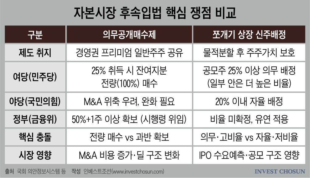 물적분할 후 자회사 상장 시 기존 모회사 주주에게 신주를 우선 배정하는 '쪼개기 상장' 관련 제도 역시 충돌 지점이 뚜렷하다. 여당안은 공모주 물량의 25%에서 많게는 70% 이상을 기존 주주에게 의무 배정하는 방안을 담고 있다. 반면 야당안은 20% 이내 범위에서 자율 배정하는 방식이다. 금융당국 역시 시장 영향 등을 고려해 저비율·유연 적용이 필요하다는 입장이다.