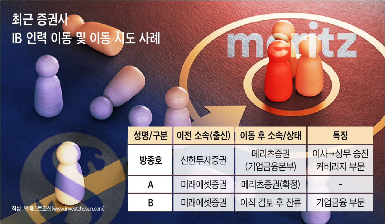 실제로 일부 인력은 이직을 타진했다가 잔류를 선택하는 등 ‘이동과 보류’가 동시에 나타나는 모습이다. 미래에셋증권 기업금융 부문의 한 실무진은 최근 이직을 검토했으나 처우 협상 과정에서 기존 회사에 남기로 한 것으로 전해졌다. 반면 같은 회사의 또 다른 인력은 메리츠증권으로의 이직을 확정하고 조만간 회사에 퇴사를 통보할 예정이다.