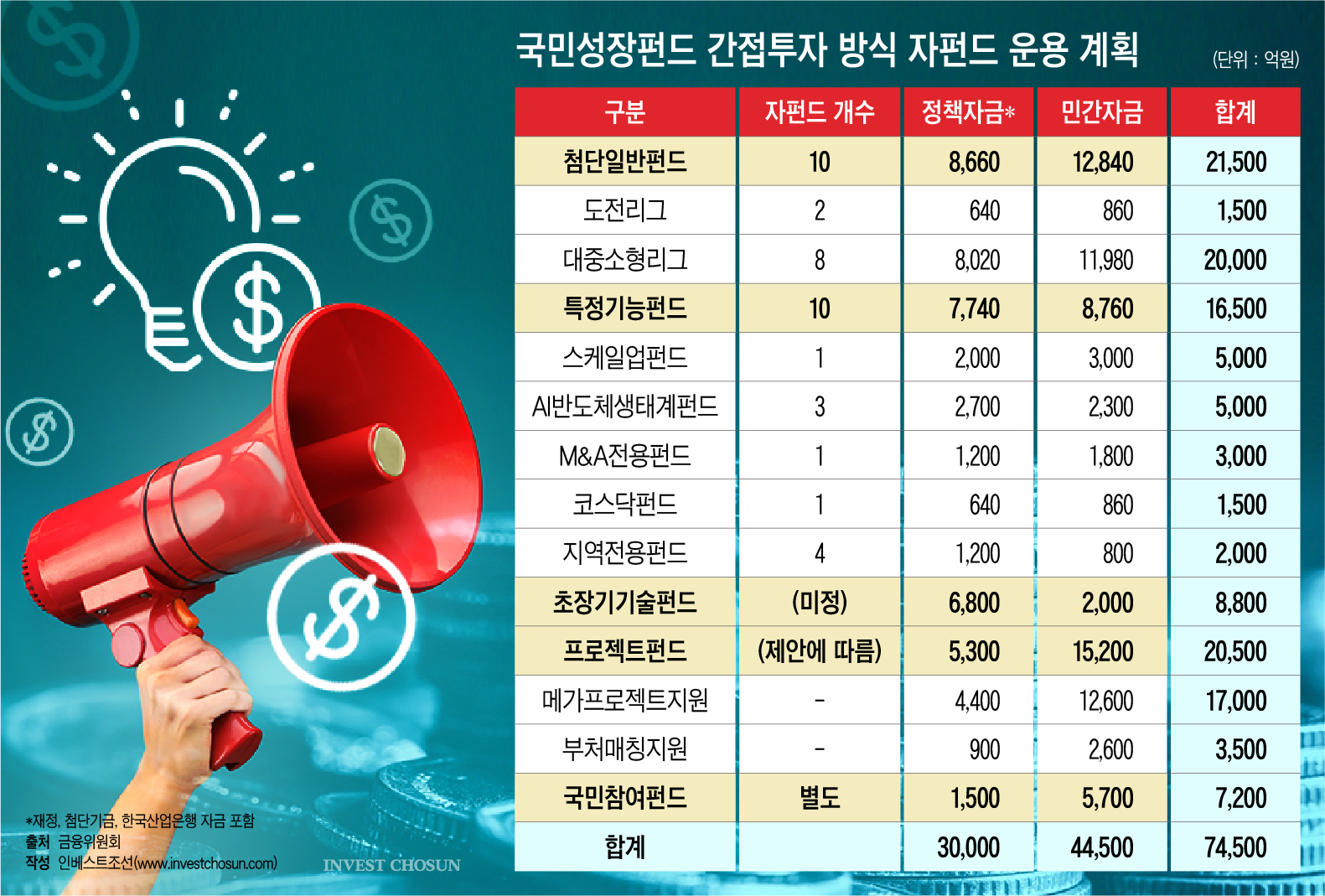 금융위원회가 14일 발표한 국민성장펀드 첨단산업생태계 지원 강화 방안에 따르면 올해 간접투자 부문에는 7조4500억원의 자금이 투입될 것으로 예상된다. 이는 민간 부문에서 모집될 자금을 포함한 규모이며, 프로젝트펀드와 국민참여펀드를 제외하면 자금 운용 규모는 4조6800억원에 달한다.