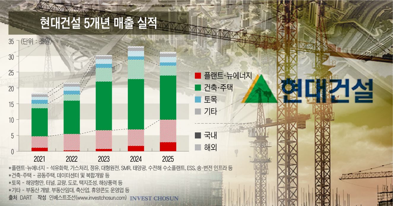 현대건설이 건축·주택 중심의 전통 포트폴리오에서 새 먹거리인 플랜트·에너지 부문으로의 전환 속도가 빨라질 것으로 보인다. 주택 시장의 업황이 어려운 영향으로 풀이된다. 에너지 관련 기대감이 이미 주가에 반영된 만큼, 이제 본계약 가시화로 이를 입증해야 하는 단계라는 분석이다.