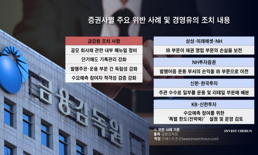 금융감독원이 회사채 발행 과정에서 계열사와 사내 조직을 동원해 수요를 부풀린 대형 증권사 6곳에 '경영유의' 조치를 내린 가운데, 증권업계는 이번 조치가 가져올 파장과 영업 현장의 변화에 촉각을 곤두세우고 있다.