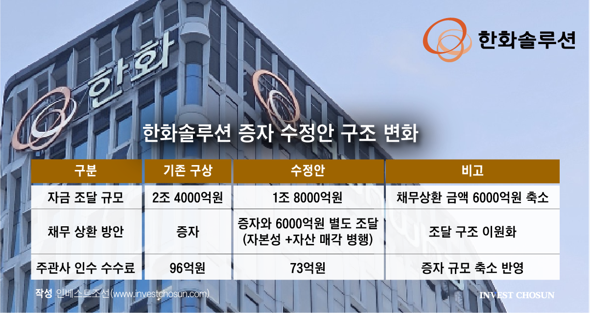 한화솔루션은 지난 17일 최근 유상증자 규모를 당초 2조4000억원에서 1조8000억원으로 축소하는 정정 증권신고서를 제출했다. 기존에 증자 대금으로 상환하려 했던 6000억원 규모의 채무는 자본성 조달과 자산 매각을 통해 별도로 해결하겠다는 시나리오다.