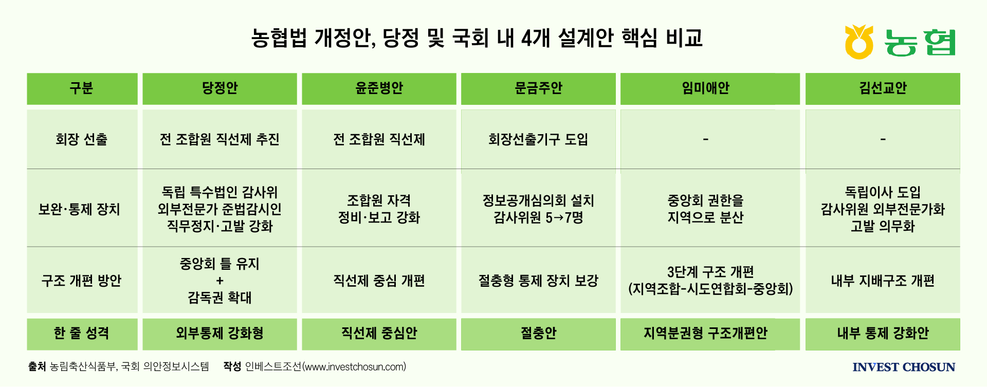 윤준병 더불어민주당 의원안은 전체 조합원 직선제를 전면에 내세운다. 조합원 자격을 매년 조사·정비해 농식품부에 보고하도록 한 점도 특징이다. 반면 김선교 국민의힘 의원안은 독립이사제 도입, 조합감사위원 전원 외부전문가화, 고발 의무화, 이사·감사 연임 제한 등 내부 지배구조 개편에 무게를 둔다.