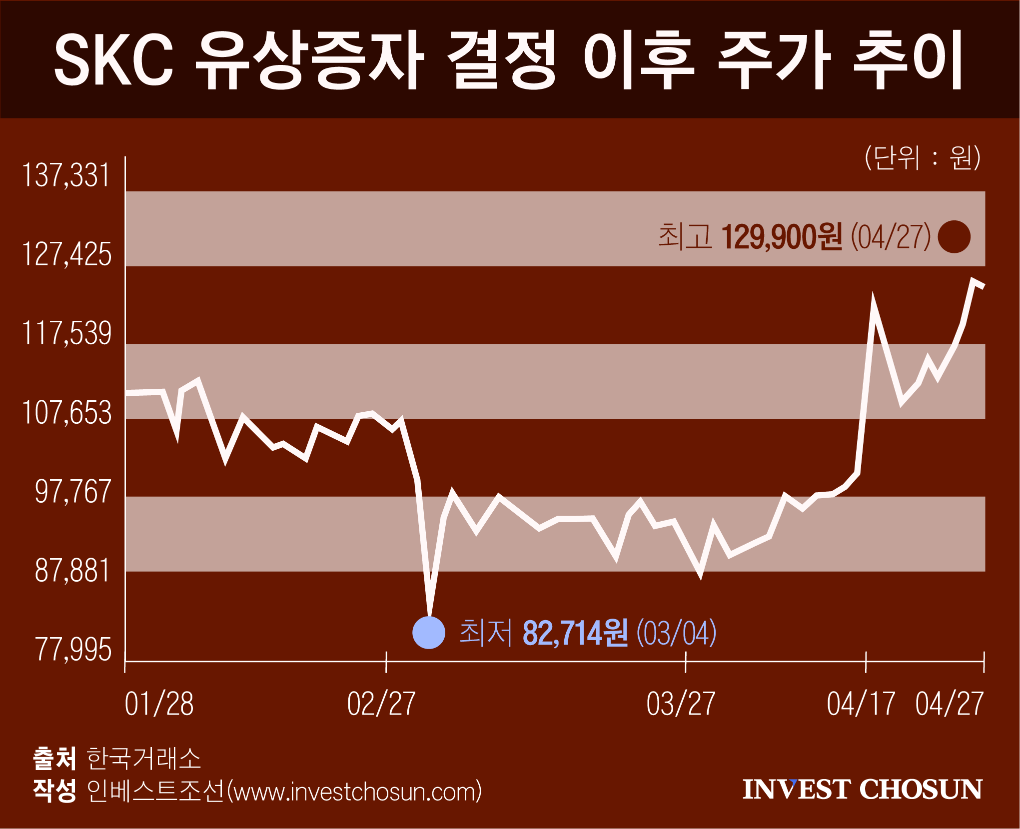 앞서 SKC는 약 1조원 규모 유상증자를 추진했지만 주가 급락으로 조달 금액 축소 우려가 제기돼 왔다. SKC 주가는 2월 말 하락세로 전환해 3월 4일에는 8만8000원까지 떨어지기도 했다. 최근 반등세를 보이면서 이러한 우려는 일부 완화됐지만, 청약 시점까지 흐름이 이어질지는 여전히 변수로 남아 있다.